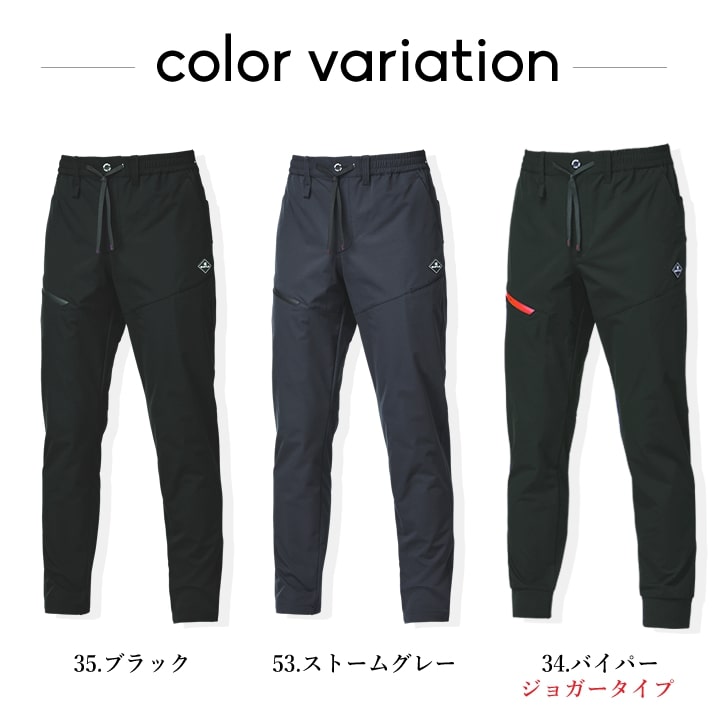 素材:4WAYストレッチドビークロス 伸長率約20%・吸汗速乾 混率:複合繊維ポリエステル80%・ポリエステ20%・ポリウレタン5% リブ:ポリエステル95%・ポリウレタン5%(34.バイパーのみ) |