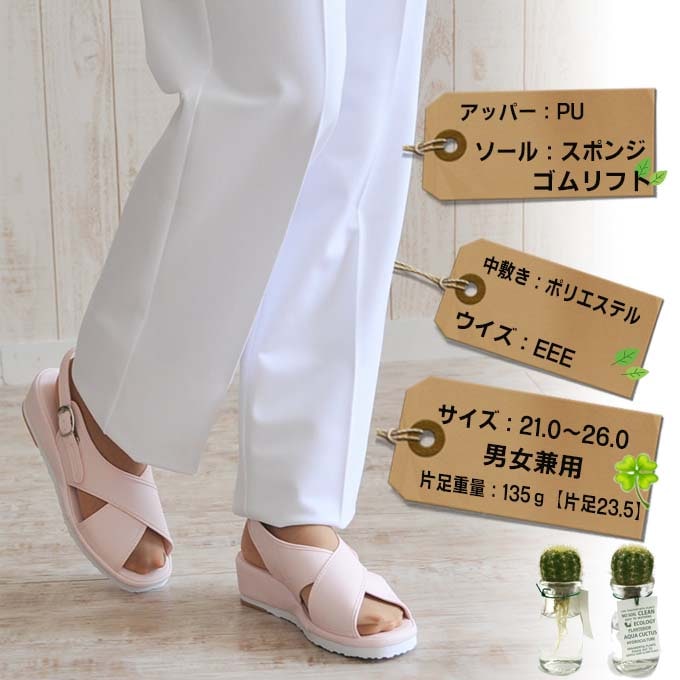 | f750 クロスサンダル【ナースシューズ】 ◆甲皮:PU(ポリウレタン) ◆底:スポンジ/ゴムリフト ◆ヒール:40mm ソフトに甲部分を包み込んで軽く、環境にもやさしいポリウレタン素材を使用。 従来のナースサンダルと比較して、片足マイナス約40gの軽量化を実現。 中敷には前すべりしにくい素材を使用。汚れやホコリが付着しにくいように改良 しました。 |