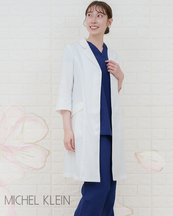 ・ミッシェルクラン洗練されたレディースコート。 ・シェイプされたウエストラインや比翼ボタンなど、ミッシェルクランならではのエスプリがきいた一枚が完成 ・ミッシェルクランのドクターコート「MK-0012」は、医療現場での快適さと機能性を追求したレディース用白衣です。 ・七分袖のデザインは動きやすさを考慮し、ストレッチ素材を使用しているため、長時間の着用でも快適です ・ |