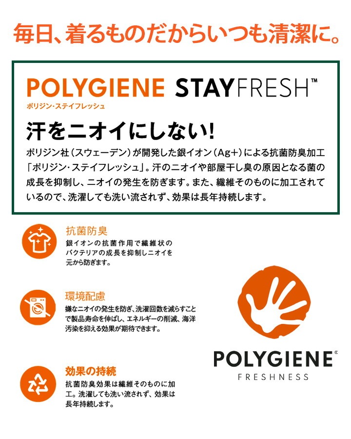 抗菌防臭加工とスナップボタンでスッキリとしたデザインが特長。