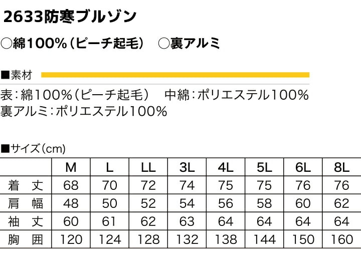 保温性抜群で暖かい防寒ブルゾン。 裏アルミ仕様の保温効果で寒い季節でも暖かい防寒アウター。 アルミ+中綿でしっかりと暖かい防寒ブルゾンです。 衿部分は難燃素材のジャージ仕様で快適に着用できます。 袖部分はカフス内部ジャージ仕様で手袋代わりになり防寒対策をしてくれます。 袖ペン差し・物が落ちにくい逆玉ポケット・内ポケットと収納性もしっかり搭載。 表は綿100ピーチ起毛で着心地が良い仕上がりになっています。 寒い季節も暖かく快適に着用できる防寒ブルゾンです。 【特徴】 ● 裏アルミ仕様 ● 衿・カフスジャージ仕様 |