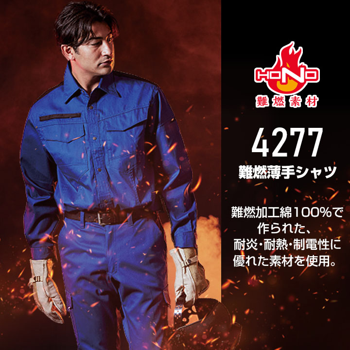 シャツ 溶接 作業服 難燃素材 火に強い 綿100 4277 HONO 長袖シャツ 薄手 制電性 防炎性 耐炎 耐熱 綿100% 工場 作業着 作業服 ユニフォーム 鳳皇 村上被服 HOOH