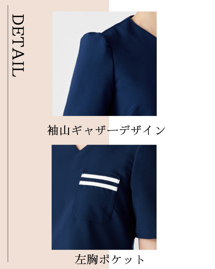 ウエストシェイプでスッキリ見えが叶うスクラブ。胸元の2本のラインで洗練された印象に。 |