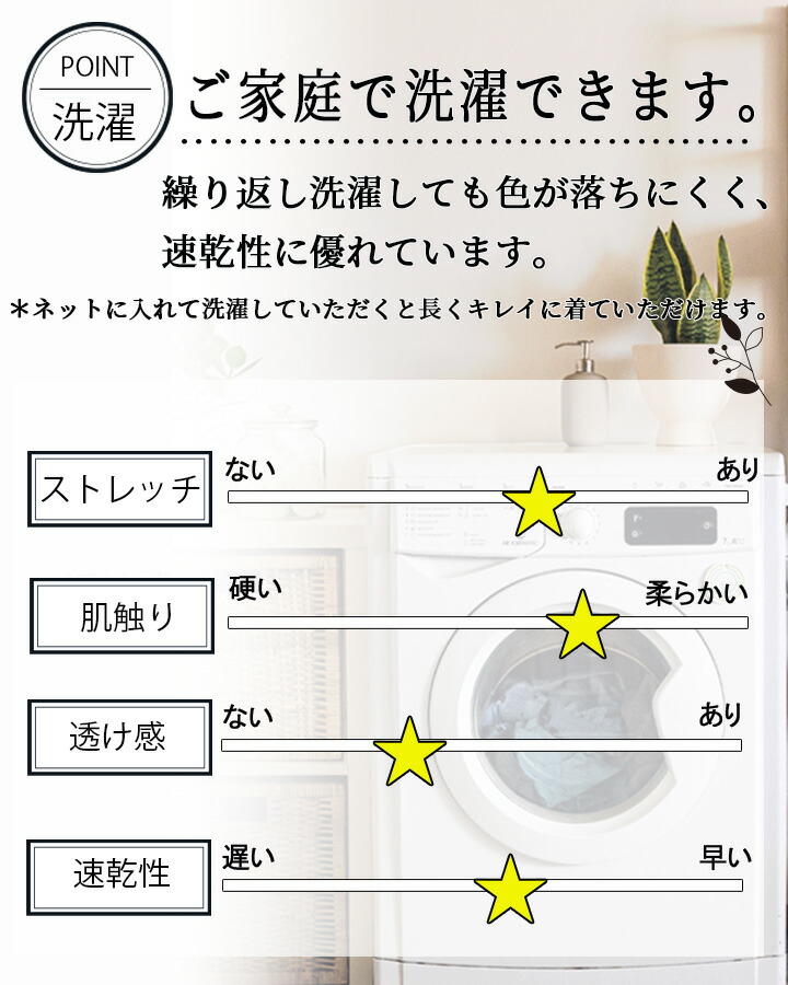 ■機能:透防止、制電、ストレッチ、制菌、イージーケア、工業洗濯対応<br>