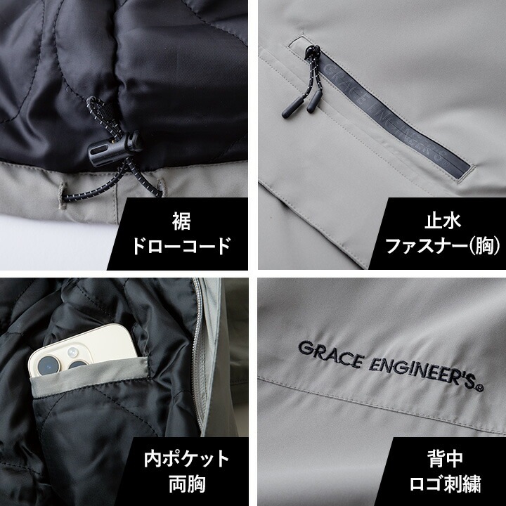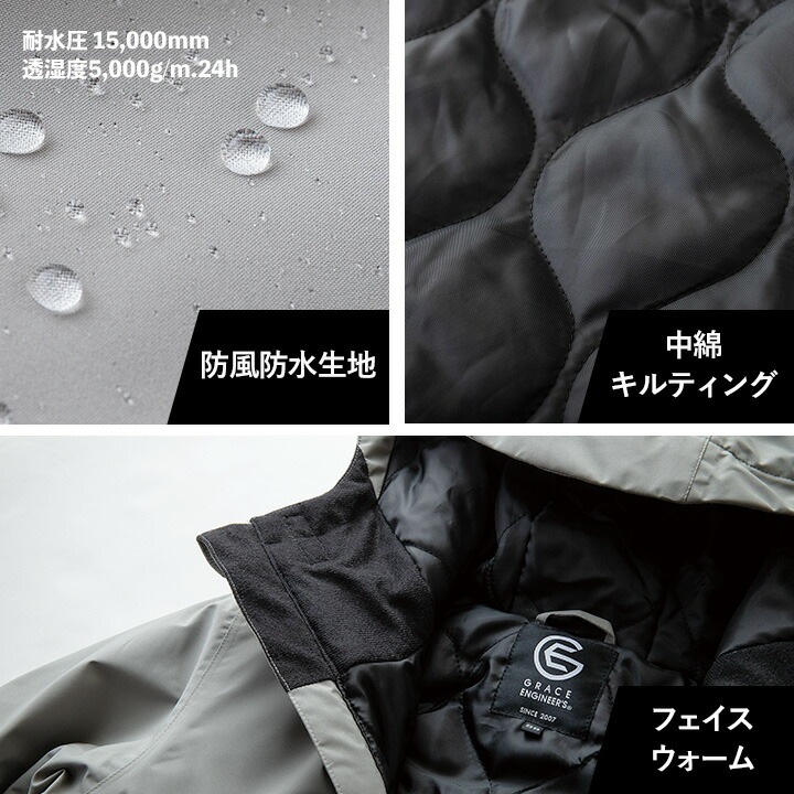 防寒着 グレースエンジニアーズ ブリザードシェルジャケット 2025AW新作 GE-751 防寒 防風 撥水 防水 フード チンガード リストガード 中綿 キルティング 秋冬 作業服 農業 酪農 畑仕事 カーデニング 農作業 バイク レディース メンズ