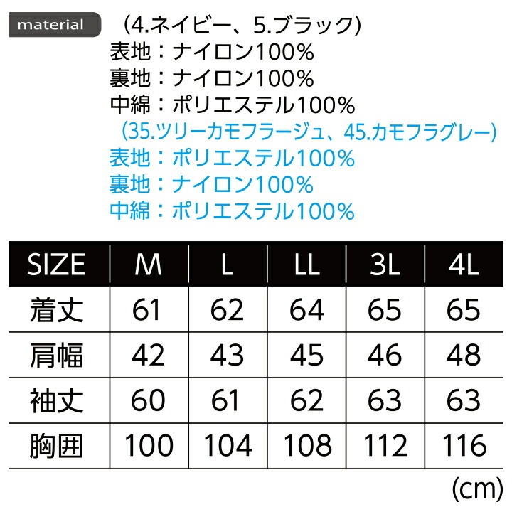 ■ 素材/【4.ネイビー5.ブラック】 表地:ナイロン100% 裏地:ポリエステル100% 中綿:ポリエステル100% リブ:ポリエステル99%・ポリウレタン1% 【35.ツリーカモフラージュ・45.カモフラグレー】 表地:ポリエステル100% 裏地:ポリエステル100% 中綿:ポリエステル100% リブ:ポリエステル99%・ポリウレタン1% |
